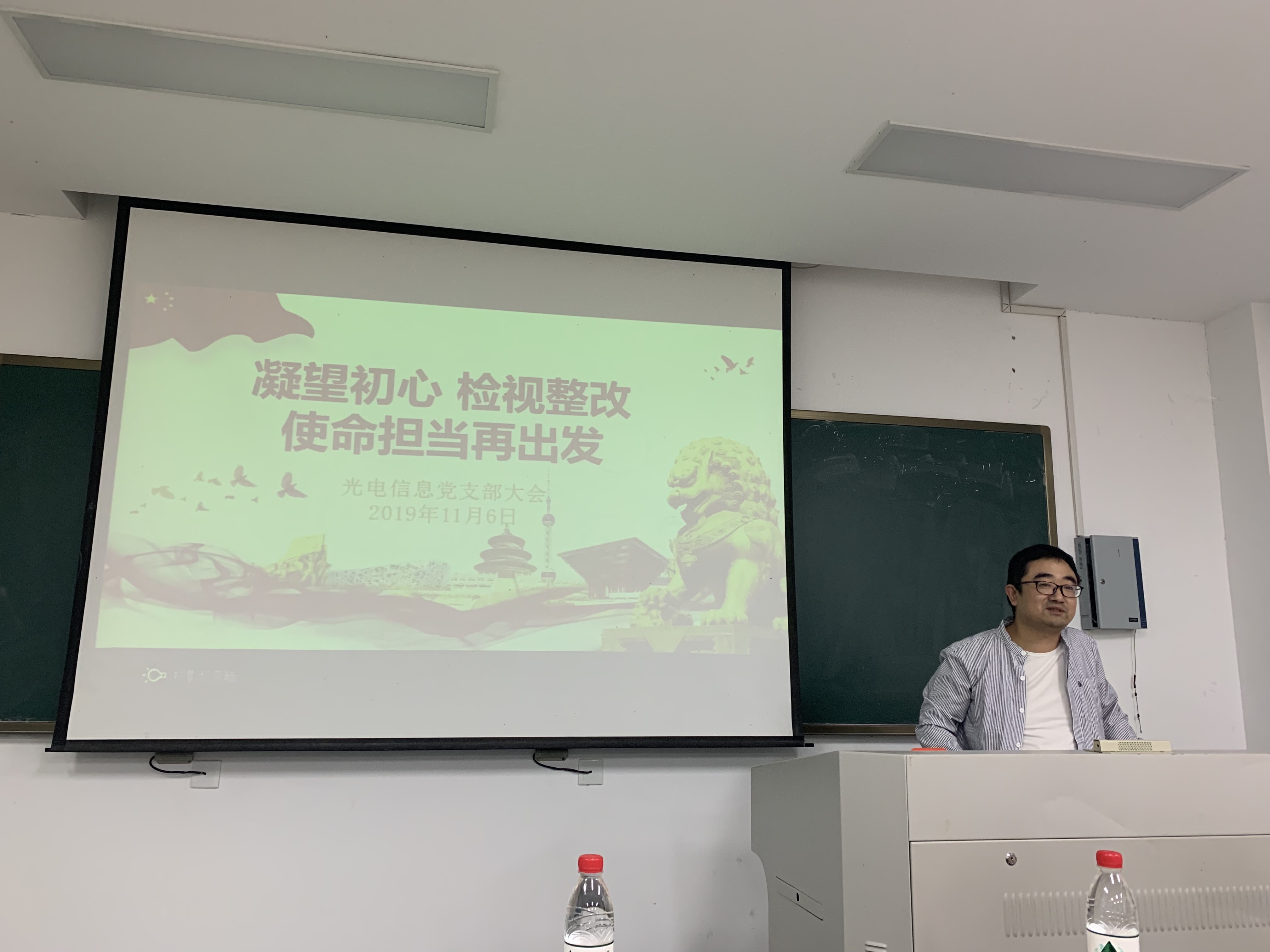 为深入开展“不忘初心、牢记使命”主题教育,充分发挥党支部主体作用,抓好抓实基层党支部、党员学习教育和检视整改,确保主题教育各项工作落细落实落深,光电信息党支部在2019年11月6日下午13:10在鸿远楼101教室开展“凝望初心 检视整改 使命担当再出发”支部大会及光电本科生导师制宣讲会主题党日活动。支部大会共有18名党员老师参加活动,4名老师(李孝峰、吴丹、邹文龙、王钦华)因工作情况请假。