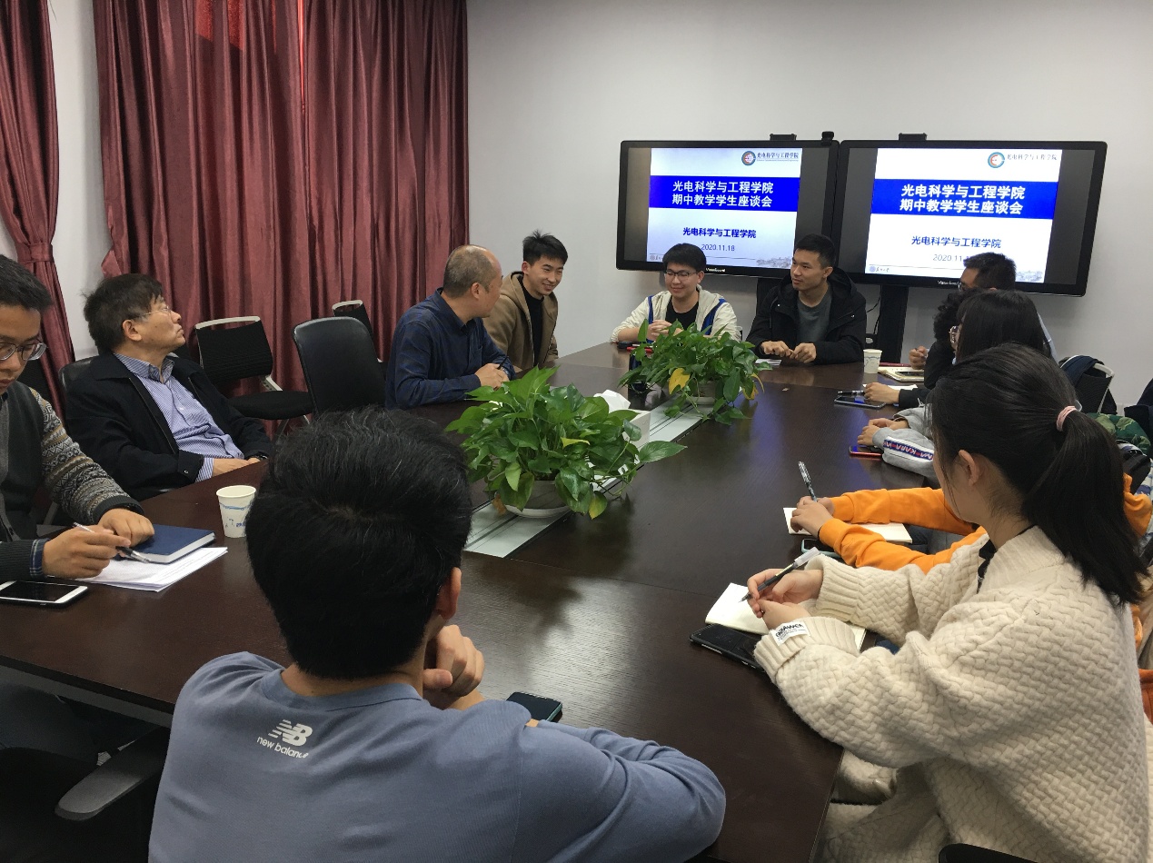 2020年11月18日下午14:30,永利皇宫 在激光楼三楼311会议室召开了期中教学教师座谈会。校教学督导顾济华教授、光电信息系主任李念强、电子测控系主任黄敏、永利皇宫 教师代表和教务办公室相关老师参加了座谈。会议由教学副院长许宜申主持。